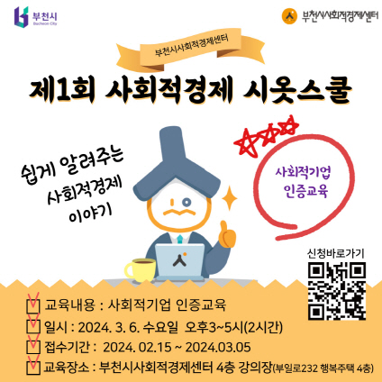 교육신청은 부천시사회적경제센터 홈페이지(www.seeot.or.kr) 또는 구글폼(https://forms.gle/S26uBXP1ng1e2eLZ8)으로 신청하면 된다.