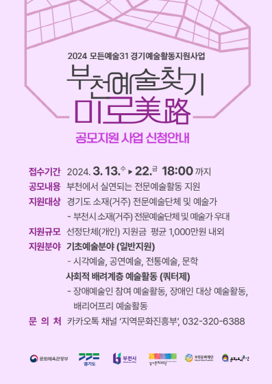 지역 문화예술 생태계를 풍성하게 할 예술인을 찾는다. 부천문화재단(이하 재단)은 3월 13일(수)부터 3월 22일(금) 오후 6시까지 ‘2024 경기예술활동 지원사업 모든예술31 : 부천예술찾기 미로(美路)’에 참여할 예술가를 공개 모집한다. ‘부천예술찾기 미로’는 부천 문화공간이나 지역공동체와 연계한 예술 활동 지원을 통해 예술인의 창작 기회와 시민 예술 향유 기회를 늘리는 사업이다.